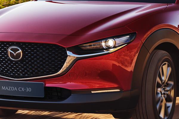 Pada bagian tampilan depan terlihat lebih gagah dengan adanya grille berukuran besar dan perpaduan lis bagian bawahnya berwarna silver. Untuk bagian depan Mazda CX-30 terdapat headlamp yang berupa Daytime Running Light. Tersusun menjadi bentuk seperti silinder yang artistik.
